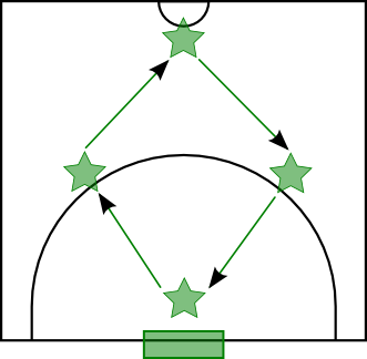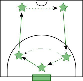 When there are 5 members on a team we play a 1-2-2 and rotate every 5 mintues. Since play is most fun in a 5v5 game this rotation allows for up to 7 players to play on each team. At each rotation you will follow the arrow to the next position. If there are 5 players on your team then nobody sits out. If there are 6 players then the person following the dotted line will be replaced by the player who was sitting out. If there are 7 players then the players following the dotted and the dashed lines are replaced.
